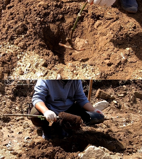 ⓐ 구덩이 파기 : 묘목을 심기 위해 제일 먼저 묘목을 심을 구덩이를 파줍니다. 구덩이의 크기는 묘목 뿌리의 크기에 따라 달라지지만, 보통 뿌리가 자리잡을 수 있도록 묘목의 뿌리 크기보다 약간 더 크게 파줍니다.